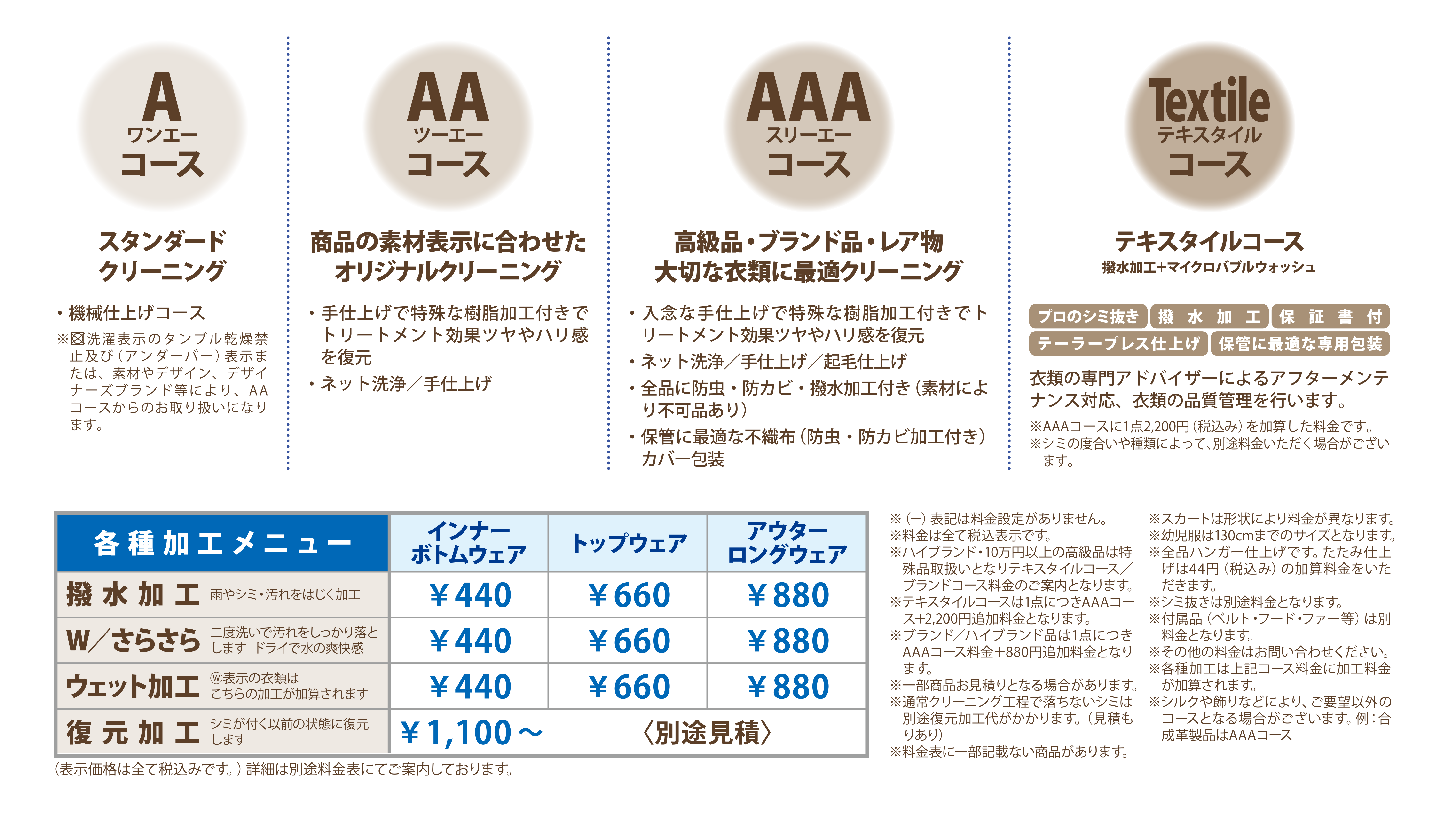 ※区洗濯表示のタンブル乾燥禁止及び(アンダーバー)表示または、素材やデザイン、デザイナーズブランド等により、AAコースからのお取り扱いになリます。